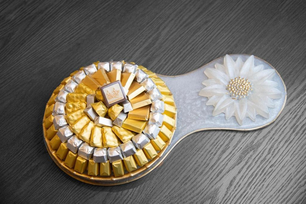 صينية فاخرة مليئة بأجود أنواع الشوكولاته المتنوعة والفاخرة من سكويركوكيزحبة بندقويفركسر بندقلوتستشيز كيك